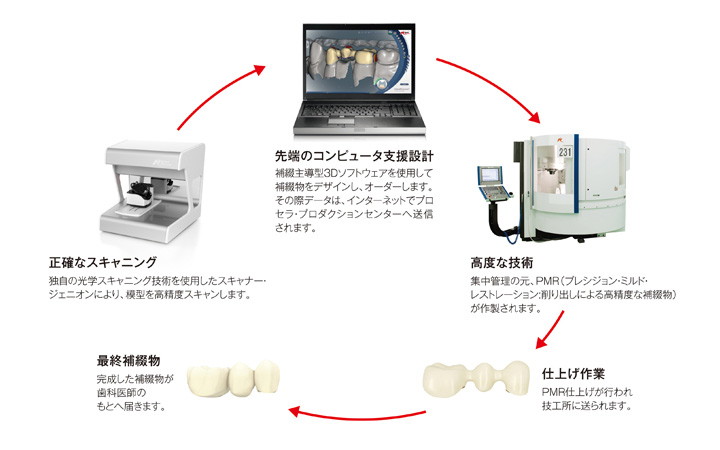 ノーベルプロセラは強さと審美性を兼ね備えた材料を使用し、予知性の高いインプラント上部構造、優れた審美的結果が得られるシステムです。歯型をレーザースキャンしCAD-CAM技術により最終的な人工歯を製作いたします。インプラント、天然歯のどちらにも適用でき、様々な症例に対応する修復システムを当院はご提供いたします。